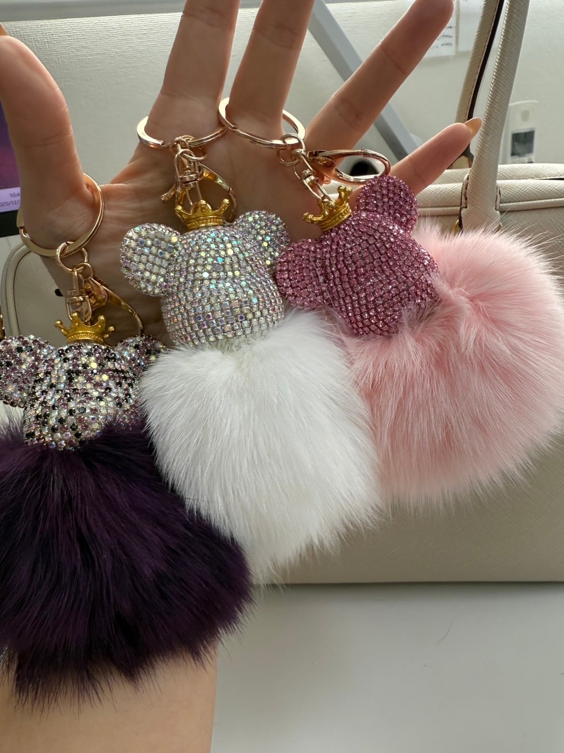可愛らしいラインストーンクマちゃんファーベアは、日常のスタイルを一層引き立てるアイテムです。きらきらと輝くラインストーンが施されたデザインは、シンプルながらも目を引く魅力があります。カジュアルなコーディネートから、特別なシーンまで、幅広く活躍すること間違いありません。